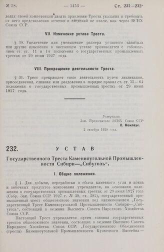 Устав Государственного Треста Каменноугольной Промышленности Сибири—„Сибуголь". Утвержден ВСНХ Союза ССР 2 октября 1928 года