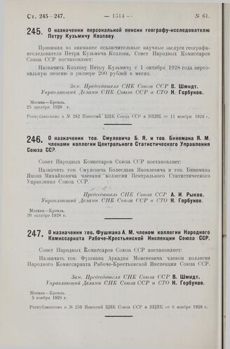 О назначении тов. Смулевича Б. Я. и тов. Бинемана Я. М. членами коллегии Центрального Статистического Управления Союза ССР. 30 октября 1928 г.