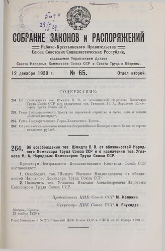 Об освобождении тов. Шмидта В. В. от обязанностей Народного Комиссара Труда Союза ССР и о назначении тов. Угланова Н. А. Народным Комиссаром Труда Союза ССР. 29 ноября 1928 г.