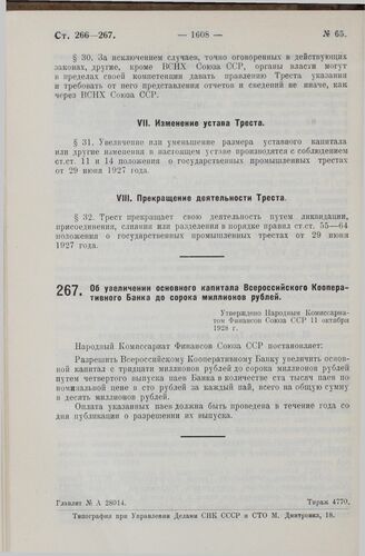Об увеличении основного капитала Всероссийского Кооперативного Банка до сорока миллионов рублей. Утверждено Народным Комиссариатом Финансов Союза ССР 11 октября 1928 г.