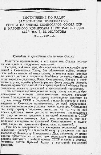 Выступление по радио Заместителя Председателя Совета Народных Комиссаров Союза ССР и Народного Комиссара Иностранных Дел СССР тов. В. М. Молотова. 22 июня 1941 года