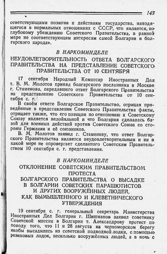В Наркоминделе. Неудовлетворительность ответа Болгарского Правительства на представление Советского Правительства от 10 сентября. 17 сентября 1941 года