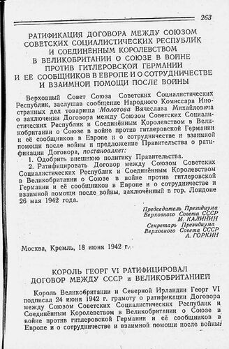 Ратификация Договора между Союзом Советских Социалистических Республик и Соединенным Королевством в Великобритании о союзе в войне против гитлеровской Германии и ее сообщников в Европе и о сотрудничестве и взаимной помощи после войны. 18 июня 1942...