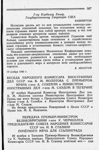Беседа Народного Комиссара Иностранных Дел СССР тов. В. М. Молотова с Премьером Ирана г-ном А. Сохейли и Министром Иностранных Дел г-ном М. Саедом в Тегеране. 27 ноября 1943 года