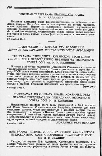 Телеграмма Премьер-министра Греции г-на Цудероса Председателю Совета Народных Комиссаров СССР И.В. Сталину. 6 ноября 1942 г.