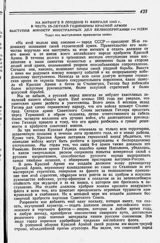 На митинге в Лондоне 21 февраля 1943 г. в честь 25-летней годовщины Красной Армии выступил министр иностранных дел Великобритании г-н Иден. 23 февраля 1943 г.