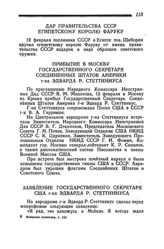 Прибытие в Москву Государственного Секретаря Соединенных Штатов Америки г-на Эдварда Р. Стеттиниуса. 12 февраля 1945 года