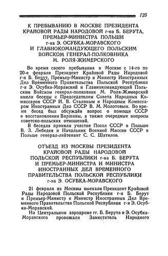К пребыванию в Москве Президента Крайовой Рады Народовой г-на Б. Берута, Премьер-Министра Польши г-на Э. Осубка-Моравского и Главнокомандующего Польским войском генерал-полковника М. Роля-Жимерского. 14—20 февраля 1945 года