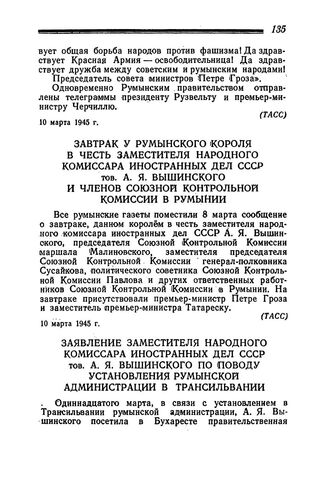 Заявление Заместителя Народного Комиссара Иностранных Дел СССР тов. А. Я. Вышинского по поводу установления румынской администрации в Трансильвании. 11 марта 1945 года