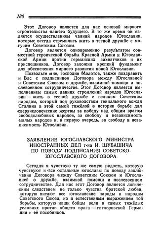 Заявление Югославского Министра Иностранных Дел г-на И. Шубашича по поводу подписания Советско-Югославского Договора. 11 апреля 1945 года