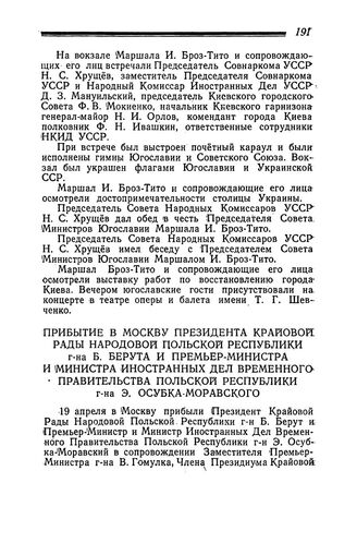 Прибытие в Москву Президента Крайовой Рады Народовой Польской Республики г-на Б. Берута и Премьер-Министра и Министра Иностранных дел Временного Правительства Польской Республики г-на Э. Осубка-Моравского. 19 апреля 1945 года