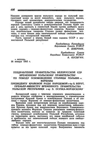 Поздравление Правительства Белорусской ССР Временному Польскому Правительству по поводу освобождения столицы Польши — Варшавы. Г. Минск, 26 января 1945 года