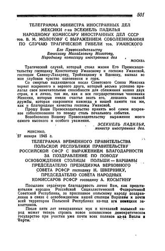 Телеграмма Министра Иностранных Дел Мексики г-на Эсекиель Падилья Народному Комиссару Иностранных Дел СССР тов. В. М. Молотову с выражением соболезнования по случаю трагической гибели тов. Уманского. Мексико, 27 января 1945 года