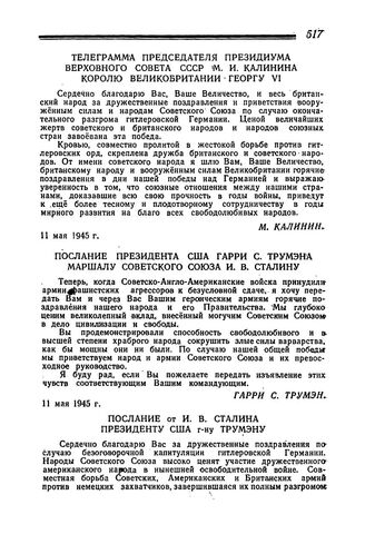 Обмен поздравлениями между советскими и иностранными государственными деятелями по случаю безоговорочной капитуляции гитлеровской Германии 8 мая 1945 года. Послание президента США Гарри С. Трумэна маршалу Советского Союза И. В. Сталину. 11 мая 194...