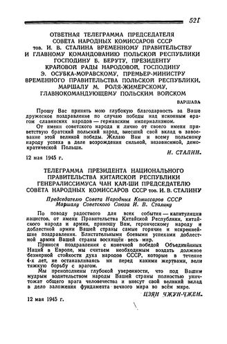Обмен поздравлениями между советскими и иностранными государственными деятелями по случаю безоговорочной капитуляции гитлеровской Германии 8 мая 1945 года. Телеграмма президента Национального правительства Китайской Республики генералиссимуса Чан Кай-ши председателю Совета Народных Комиссаров СССР тов. И. В. Сталину. 12 мая 1945 г.