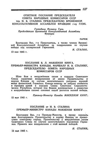 Обмен поздравлениями между советскими и иностранными государственными деятелями по случаю безоговорочной капитуляции гитлеровской Германии 8 мая 1945 года. Ответное послание председателя Совета Народных Комиссаров СССР тов. И. В. Сталина председателю Временной Консультативной Ассамблеи Франции г-ну Гуэн. 13 мая 1945 г.