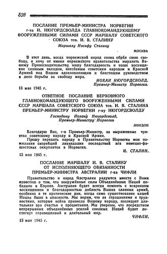 Обмен поздравлениями между советскими и иностранными государственными деятелями по случаю безоговорочной капитуляции гитлеровской Германии 8 мая 1945 года. Послание премьер-министра Норвегии г-на И. Нюгордсволда Главнокомандующему Вооруженными силами СССР маршалу Советского Союза тов. И. В. Сталину. 13 мая 1945 г.