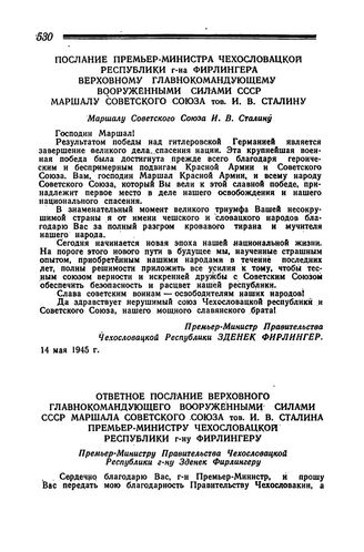 Обмен поздравлениями между советскими и иностранными государственными деятелями по случаю безоговорочной капитуляции гитлеровской Германии 8 мая 1945 года. Ответное послание Верховного Главнокомандующего Вооруженными силами СССР маршала Советского Союза тов. И. В. Сталина премьер-министру Чехословацкой Республики г-ну Фирлингеру. 14 мая 1945 г.