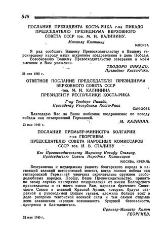 Обмен поздравлениями между советскими и иностранными государственными деятелями по случаю безоговорочной капитуляции гитлеровской Германии 8 мая 1945 года. Послание премьер-министра Болгарии г-на Георгиева председателю Совета Народных Комиссаров СССР тов. И. В. Сталину. 23 мая 1945 г.