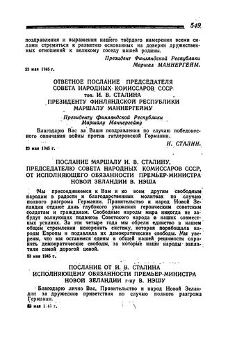 Обмен поздравлениями между советскими и иностранными государственными деятелями по случаю безоговорочной капитуляции гитлеровской Германии 8 мая 1945 года. Ответное послание председателя Совета Народных Комиссаров СССР тов. И. В. Сталина президенту Финляндской Республики маршалу Маннергейму. 23 мая 1945 г.