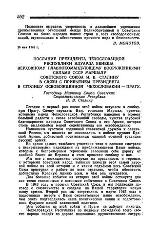 Послание Президента Чехословацкой Республики Эдуарда Бенеша Верховному Главнокомандующему Вооруженными силами СССР Маршалу Советского Союза И. В. Сталину в связи с прибытием Президента в столицу освобожденной Чехословакии — Прагу. Прага, 16 мая 1945 года