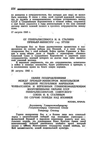 Обмен поздравлениями между Премьер-Министром Монгольской Народной Республики Маршалом Чойбалсаном и Верховным Главнокомандующим Вооруженными силами СССР Генералиссимусом Советского Союза И. В. Сталиным по случаю победы над Японией. 29 августа 1945 года