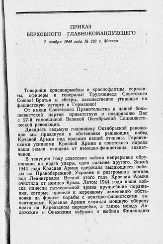 Приказ Верховного Главнокомандующего. 7 ноября 1944 года № 220 г. Москва