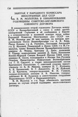 Завтрак у Народного Комиссара Иностранных Дел СССР тов. В. М. Молотова в ознаменование годовщины Советско-Английского Союзного Договора. 26 мая 1944 г.