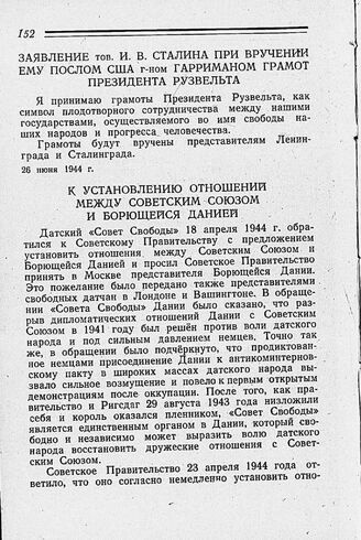 Заявление тов. И. В. Сталина при вручении ему послом США г-ном Гарриманом грамот Президента Рузвельта. 26 июня 1944 г.