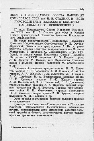 Обед у Председателя Совета Народных Комиссаров СССР тов. И. В. Сталина в честь руководителей Польского Комитета Национального Освобождения. 27 июля 1944 г.
