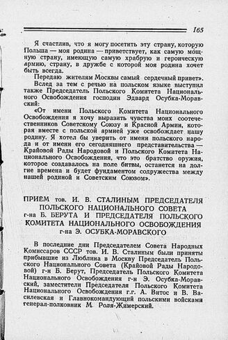 Прием тов. И. В. Сталиным Председателя Польского Национального Совета г-на Б. Берута и Председателя Польского Комитета Национального Освобождения г-на Э. Осубка-Моравского. 9 августа 1944 г.