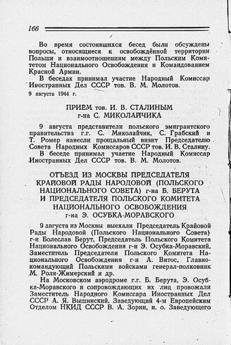 Отъезд из Москвы Председателя Крайовой Рады Народовой (Польского Национального Совета) г-на Б. Берута и Председателя Польского Комитета Национального Освобождения г-на Э. Осубка-Моравского. 9 августа 1944 г.