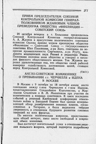 Прием Председателем Союзной Контрольной Комиссии генерал-полковником Ждановым членов президиума общества «Финляндия — Советский Союз». 20 октября 1944 г.