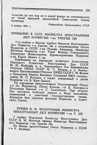Прибытие в СССР Министра Иностранных Дел Норвегии г-на Трюгве Ли. 7 ноября 1944 г.