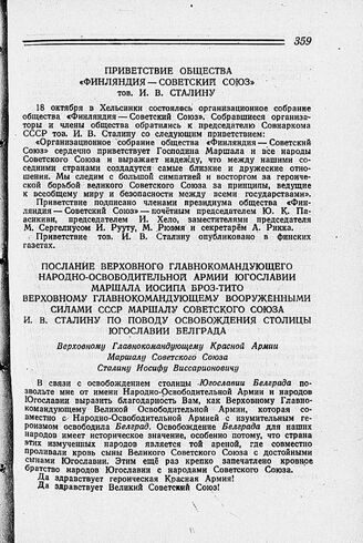 Приветствие общества «Финляндия — Советский Союз» тов. И. В. Сталину. 18 октября 1944 года