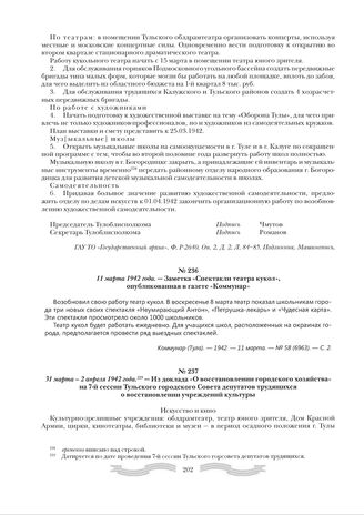 31 марта - 2 апреля 1942 года. - Из доклада «О восстановлении городского хозяйства» на 7-й сессии Тульского городского Совета депутатов трудящихся о восстановлении учреждений культуры