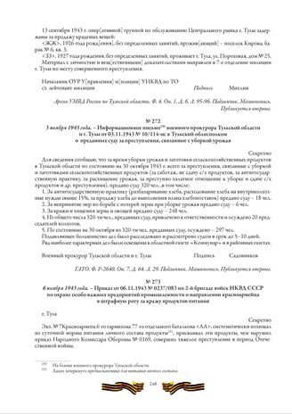 3 ноября 1943 года. - Информационное письмо военного прокурора Тульской области и г. Тулы от 03.11.1943 № 10/114-ис в Тульский облисполком о преданных суду за преступления, связанные с уборкой урожая // ГАТО. Ф. Р-2640. Оп. 7. Д. 64. Л. 29. Подлинник. Машинопись. Публикуется впервые.