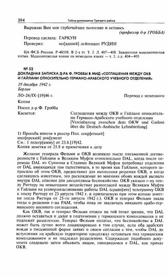 Докладная записка д-ра Ф. Гроббы в МИД «Соглашения между ОКВ и Гайлани относительно германо-арабского учебного отделения». 19 декабря 1942 г. Берлин // ЦА ФСБ России. Р-48558. В 2-х тт. Т. 2. Л. 78—80. Заверенная машинописная копия. Машинописная копия на немецком языке — т. 2. л.д. 75—77.