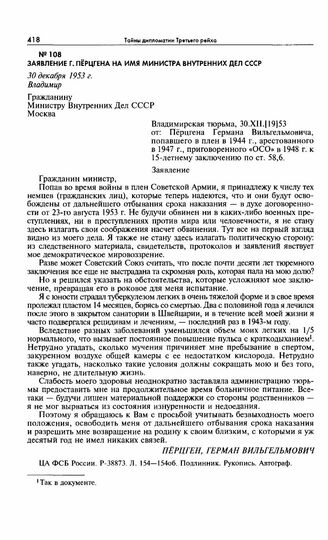 Заявление Г. Перцгена на имя министра внутренних дел СССР. 30 декабря 1953 г. Владимир // ЦА ФСБ России. Р-38873. Л. 154—154об. Подлинник. Рукопись. Автограф.