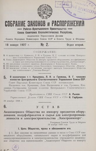Собрание законов и распоряжений Рабоче-Крестьянского Правительства СССР за 1927 г. № 1-25. Отдел второй. — М., б. г.