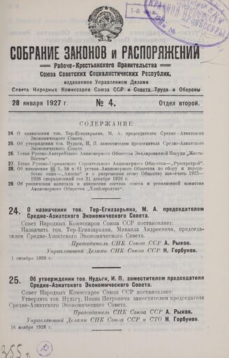 О назначении тов. Тер-Егиазарьяна, М. А. председателем Средне-Азиатского Экономического Совета. 1 октября 1926 г.