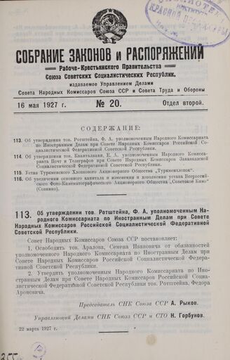 Главная Собрание законов и распоряжений правительства РСФСР и СССР Собрание законов и распоряжений Рабоче-Крестьянского Правительства ... Собрание законов и распоряжений Рабоче-крестьянского правительства ... Собрание законов и распоряжений Рабоче-Крестьянского Правительства ... Документы Об утверждении тов. Ротштейна, Ф. А. уполномоченным Народного Комис...