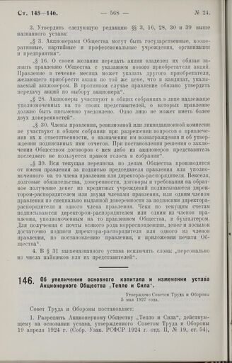 Об увеличении основного капитала и изменении устава Акционерного Общества „Тепло и Сила". Утверждено Советом Труда и Обороны 5 мая 1927 года