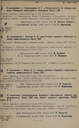 О назначении уполномоченным Народного комиссариата тяжелой промышленности Союза ССР при Совете народных комиссаров РСФСР т. Бейка Д. С. июля 1932 г. № 1069