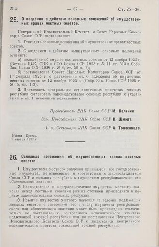 Постановление Центрального Исполнительного Комитета и Совета Народных Комиссаров. О введении в действие основных положений об имущественных правах местных советов. 9 января 1929 г.