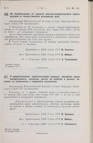 Постановление Центрального Исполнительного Комитета и Совета Народных Комиссаров. Об освобождении от единого сельско-хозяйственного налога доходов от искусственного разведения рыб. 16 января 1929 г.