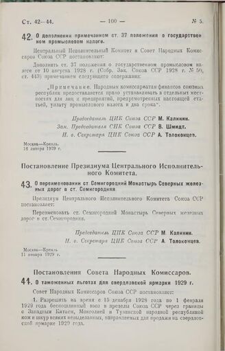 Постановление Центрального Исполнительного Комитета и Совета Народных Комиссаров. О дополнении примечанием ст. 37 положения о государственном промысловом налоге. 16 января 1929 г.