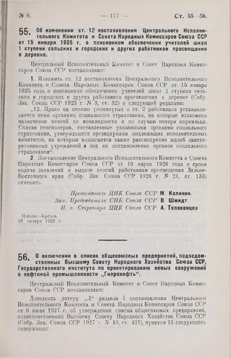 Постановление Центрального Исполнительного Комитета и Совета Народных Комиссаров. Об изменении ст. 12 постановления Центрального Исполнительного Комитета и Совета Народных Комиссаров Союза ССР от 15 января 1925 г. о пенсионном обеспечении учителей школ 1 ступени сельских и городских и других работников просвещения в деревне. 18 января 1929 г.