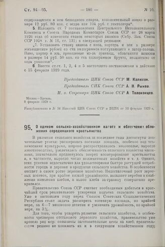 Постановление Центрального Исполнительного Комитета и Совета Народных Комиссаров. О едином сельско-хозяйственном налоге и облегчении обложения середняцкого крестьянства. 8 февраля 1929 г. // Распубликовано в № 33 Известий ЦИК Союза ССР и ВЦИК от 9 февраля 1929 г.