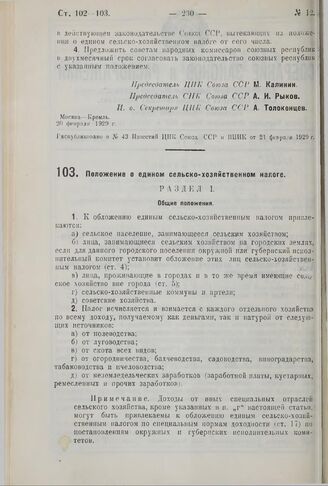 Постановление Центрального Исполнительного Комитета и Совета Народных Комиссаров. Положение о едином сельско-хозяйственном налоге. 20 февраля 1929 г.